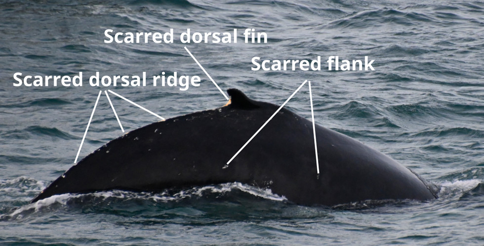 Photo-ID is a low cost, non-invasive and relatively easy method for identifying and tracking individuals. If we have a picture each time we see an individual we can follow where they travel, how they behave and how sociable they are. As humpbacks are a migratory species it also means we can see how often they come back to Faxaflói. Once photos are processed, the comparison begins. There are many ways to ID a humpback; the easiest way being their unique fluke pattern. We also photograph any other distinguishable features like notches, nicks and indentations in the dorsal fins of whales. Less permanent features like scarring or algea and barnacle growth can help as well. Scars can have many origins; human-caused by shipstrikes or entanglement in fishing gear, predator-caused by orcas or sharks, parasite-caused by barnacles, whale lice or cookie cutter sharks or not-so-friendly interactions with other whales. Furthermore, scraping over reefs or skin diseases can leave their markings as well. Each complexion is a thread in the tapestry of each whales' life story and allows us to paint a picture of what they have been going through over timeíWe have collected and catalogued photos since 2007 and compare each new photo we take to our old ones. Sometimes we find what is called "a match", so the new photo is of an individual we have seen in the past, and other times we have a "no match". Then we add this new individual to our catalogue. Needless to say, the catalogue keeps growing daily!